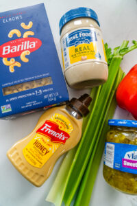 The dish starts out with elbow macaroni, cooked until al dente and then drained. You’re welcome to substitute any small pasta shape here. Next comes diced celery and red pepper for a little color and crunch, then a handful of chopped green onion for a little bite. We love a variety of textures and this combo delivers.