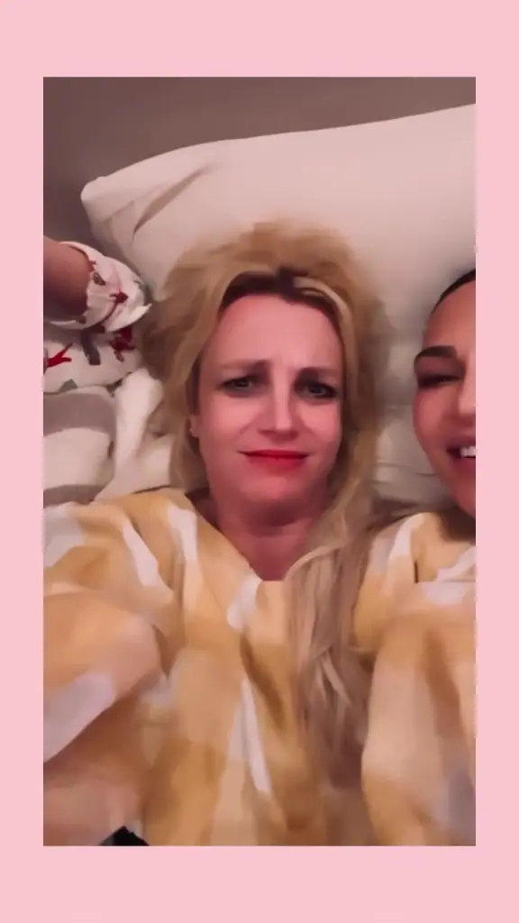 On Saturday night, the “Gimme More” singer posted a clip on Instagram of her lying in bed between the two reality stars.