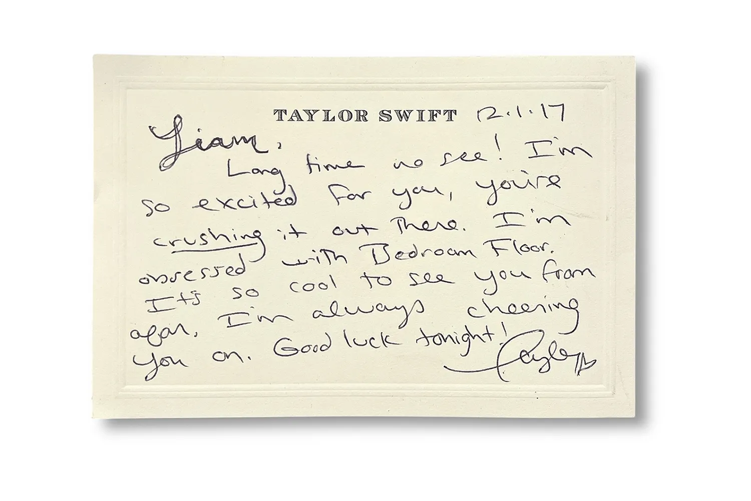 The note is printed on a card featuring Swift’s custom letterhead and reads, “Liam, Long time no see! I’m so excited for you, you’re crushing it out there. I’m obsessed with ‘Bedroom Floor.’ It’s so cool to see you from afar, I’m always cheering you on. Good luck tonight!”