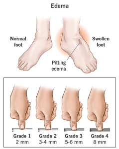 – A dent remains when you press the skin (pitting edema)