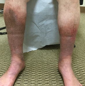As a result, small injuries cause large, dark bruises, especially on the calves and thighs.