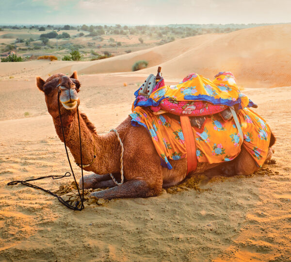 Indian camel in sand dunes of Thar desert on sunset. Caravan in Rajasthan travel tourism background safari adventure. Jaisalmer, Rajasthan, India