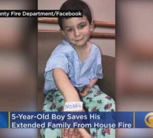 “Our hero! Five-year-old Noah woke up to find his bedroom on fire. The only exit was a window. He got himself and his sister out, then re-entered the home to alert the rest of the family.”