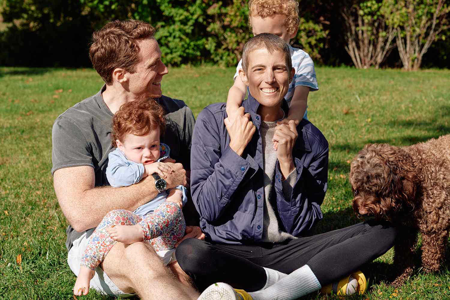 What it offers instead is something far more intimate: love in its most ordinary, unguarded form. Tatiana Schlossberg sits on the grass in a sunlit outdoor setting, smiling as one of her young children balances on her shoulders. Her husband, George Moran, is close by, holding their other child.