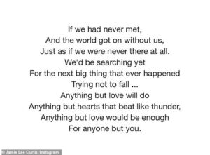 She shared lyrics that said, “If we had never met/And the world got on without us/Just as if we were never that at all,”We would still be looking for the next big thing and trying not to fall…