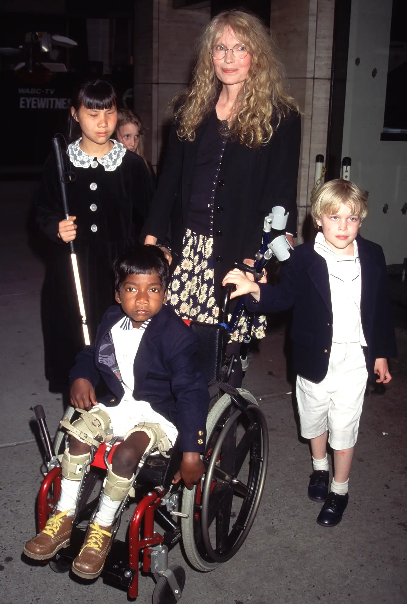 American actor Mia Farrow walking outdoors at Lincoln Center with four of her children at the premiere of director Jon Blair’s documentary, ‘Anne Frank Remembered,’