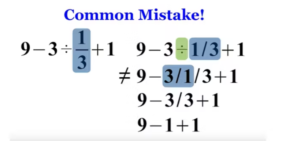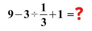 But negative one isn’t the only wrong answer. Other people got tricked by the “three divided by one third” part, largely because they were too crafty for their own good. They neglected to account for the fact that, if you turn the fraction one third into 1/3, the /, mathematically speaking, is actually a division symbol. The result is this: