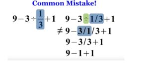 But negative one isn’t the only wrong answer. Other people got tricked by the “three divided by one third” part, largely because they were too crafty for their own good. They neglected to account for the fact that, if you turn the fraction one third into 1/3, the /, mathematically speaking, is actually a division symbol. The result is this: