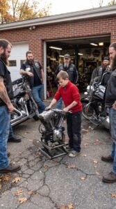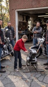 Inside the yard, engines rumbled and tools clanged against metal tables. The sound of motorcycles echoed like distant thunder. It was the kind of place that usually made adults hesitate before walking in.