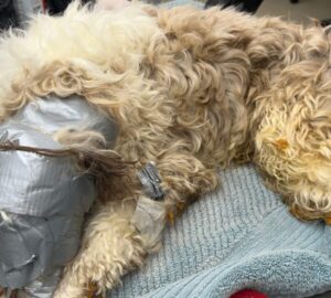 Upon arrival, the dog — later identified as Leo — was sedated to allow humane caretakers to carefully remove the duct tape without causing him further pain or stress.