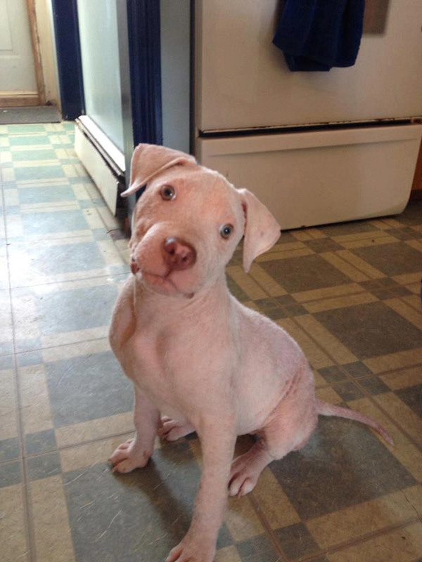 Poor little Mojo got a rough start in life. When the pit bull was four months old, he was surrendered to an animal shelter. Athough he was still just a puppy, Mojo had been neglected and was completely covered in mange.