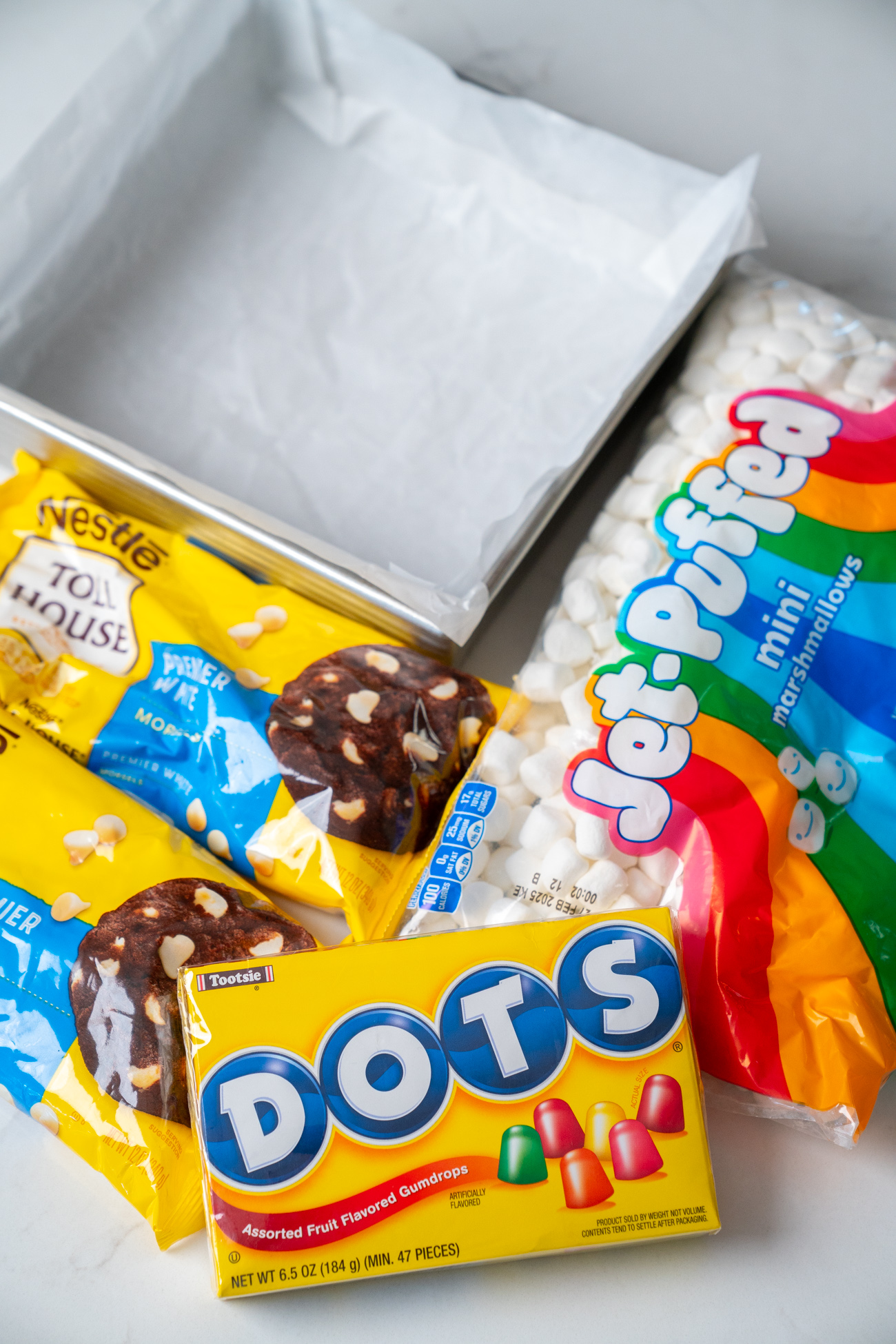 With just four ingredients and a few minutes of prep, you can whip up a batch of this candy that looks as impressive as it tastes. You’ll start out by combining the white chocolate chips, marshmallows, and butter in a large microwave-safe bowl. Stirring often, you’ll heat that mixture until it’s fully melted and a smooth and silky texture. At this point, you’ll let the nougat cool for a minute or two (so it doesn’t melt your candy!), then fold in the gumdrops or whatever goodies you’re including. Pour the mixture into a parchment-lined pan and pop it in the fridge to set for about 4 hours