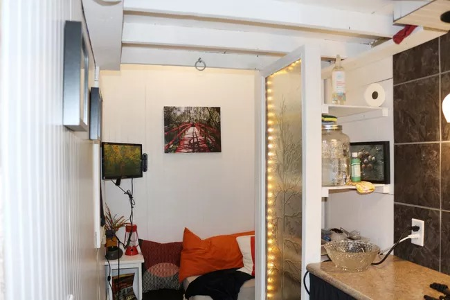 After completing the tiny home, Thill stated, “Seeing everything come together was very satisfying. There were some very challenging times throughout the build but I never wanted to quit.” As it turns out, Thill moved into this home after building it- something that was never in the works. “The tiny house was always meant to be a space to have friends over and to entertain people. I have had many friends over and we watch movies, cook food, hang out, or play games.”