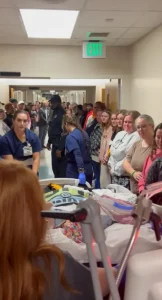 All stood in silence as Kimber — draped in a soft blanket, her hair brushed, her skin glowing under the warm hospital light — was wheeled past.
