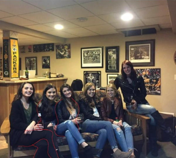 Following the tear on #2’s knee, you can see a sock on the right but not the left — that’s the clue. Girl #3 is leaning forward, using her hand on the seat behind #4 to support herself, adding to the illusion.”