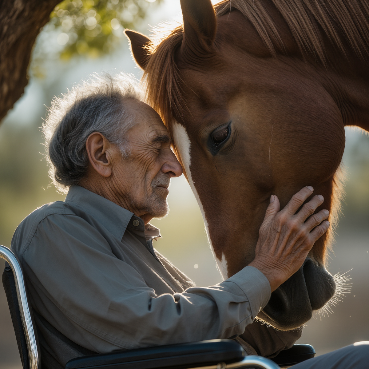 The old man leaned forward, resting his forehead against the horse’s. For a long while, they stayed like that — two souls breathing in unison, surrounded by the quiet hum of nature and the rustle of leaves in the wind.