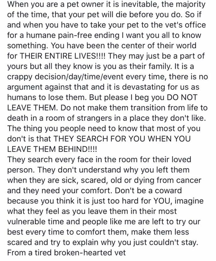 The below Facebook post from an employee at the Hillcrest Veterinary Hospital then began spreading by the thousands.