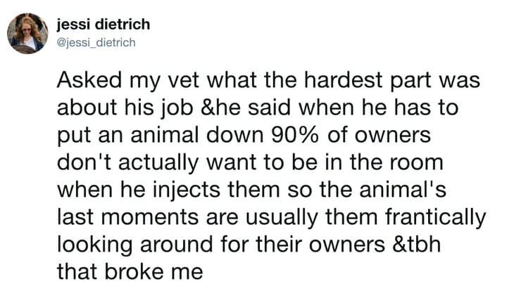 “Asked my vet what the hardest part was about his job and he said when he has to put an animal down, 90 percent of owners don’t actually want to be in the room when he injects them,” she tweeted, adding: “So the animal’s last moments are usually them frantically looking around for their owners, and to be honest, that broke me.”