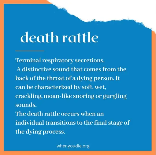 According to Medical News Today, the ‘death rattle’ is caused by changes in breathing patterns and the buildup of secretions in the throat. Hospice Nurse Julie, an expert in end-of-life care, describes the sound: